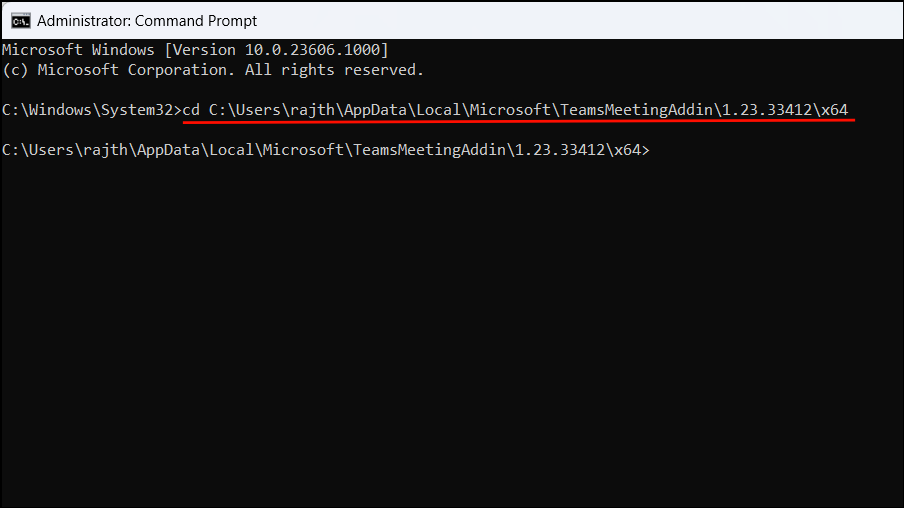 cd, press theSpacebar, paste the copied file path, and hitEnterto change the current directory. In our case, the command is:cd C:\Users\rajth\AppData\Local\Microsoft\TeamsMeetingAddin\1.23.33412\x64.