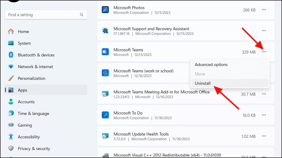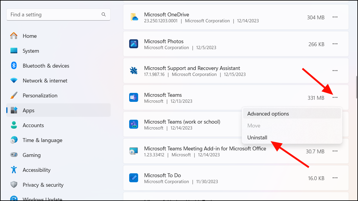 - Find the 'Microsoft Teams' app, click the three dots, and select 'Uninstall'.