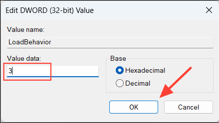 - Then, double-click the 'LoadBehavior' DWORD. If the entry doesn't exist, right-click on an empty area and select 'New' > 'DWORD (32-bit)' Value. Then, name it 'LoadBehavior'.