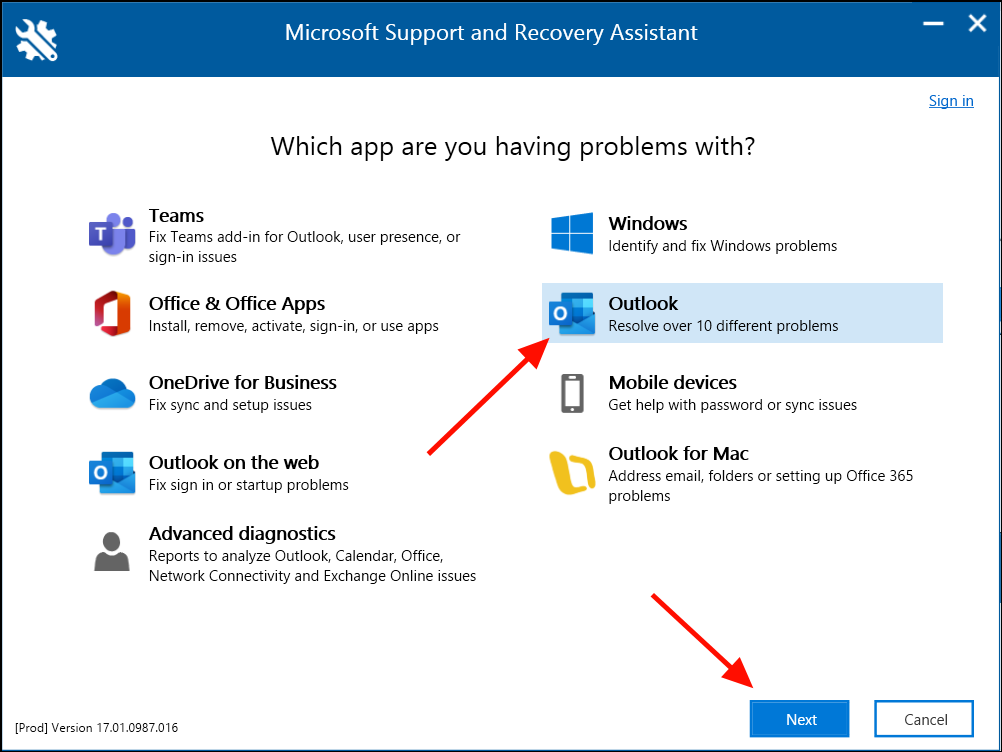 - From the list of products, select ‘Outlook’ and click ‘Next’ to continue.