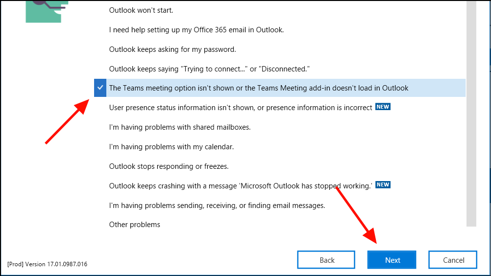 - On the next screen, select ‘The Teams meeting option isn’t shown or the Teams Meeting add-in doesn’t load in Outlook’ and click ‘Next’.