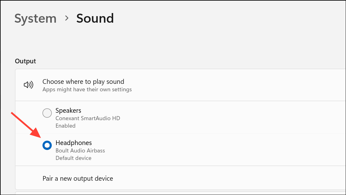 Step 2: Under the Output section, ensure your preferred audio device (such as speakers or headphones) is selected as the default output.