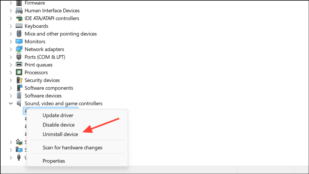 Step 4: If updating does not resolve the issue, right-click the audio device again and select Uninstall device. Restart your computer, and Windows will reinstall the default driver automatically.