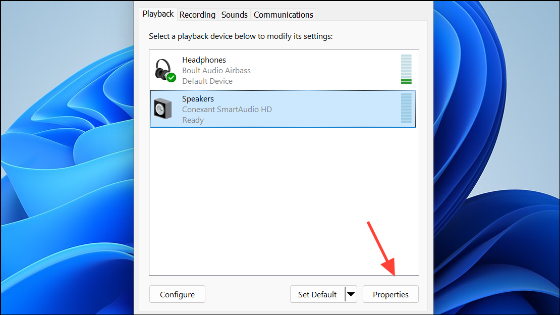 Step 2: Go to the Playback tab, select your default device, and click Properties.