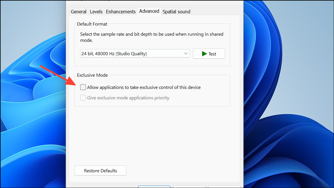 Step 3: In the Advanced tab, uncheck the box labeled Allow applications to take exclusive control of this device. Click Apply and OK to save changes.