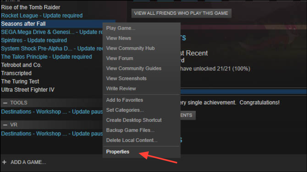 Step 1: Open Steam and go to your Library. Right-click the affected game and select Properties.