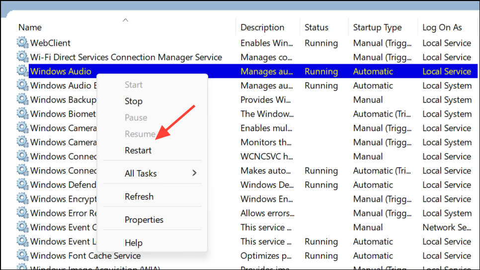 Step 3: Find Windows Audio in the list, right-click, and select Restart.