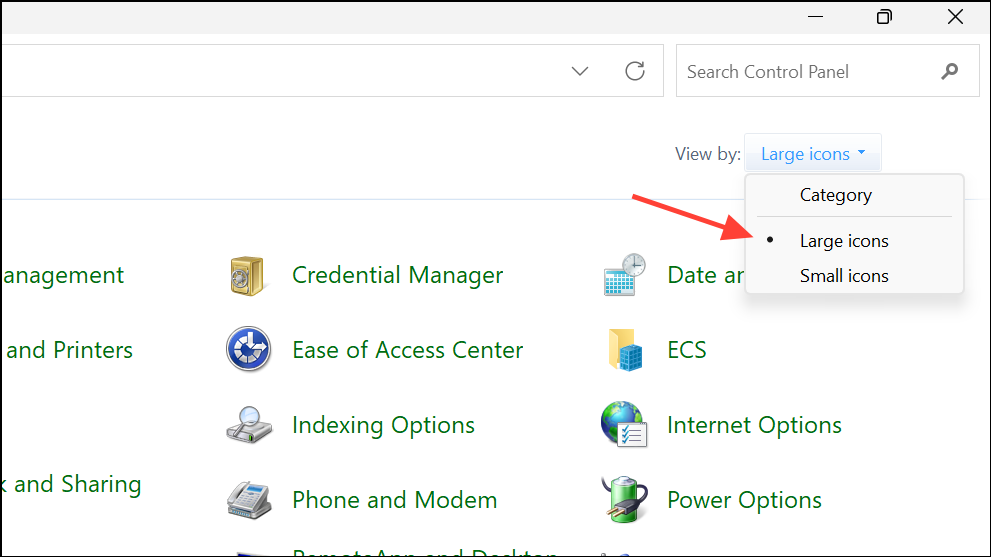 Step 1: Open the classic Control Panel by pressing Windows + S, typing Control Panel, and selecting it from the search results. In the Control Panel, set the “View by” option to Large icons for easier navigation.