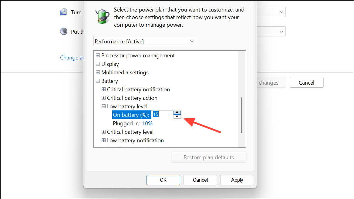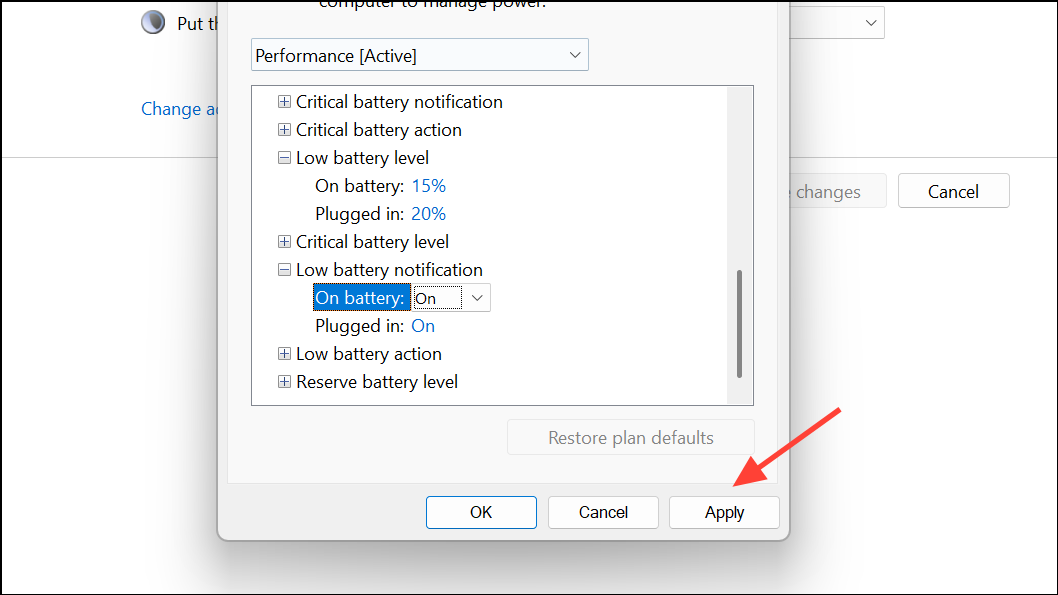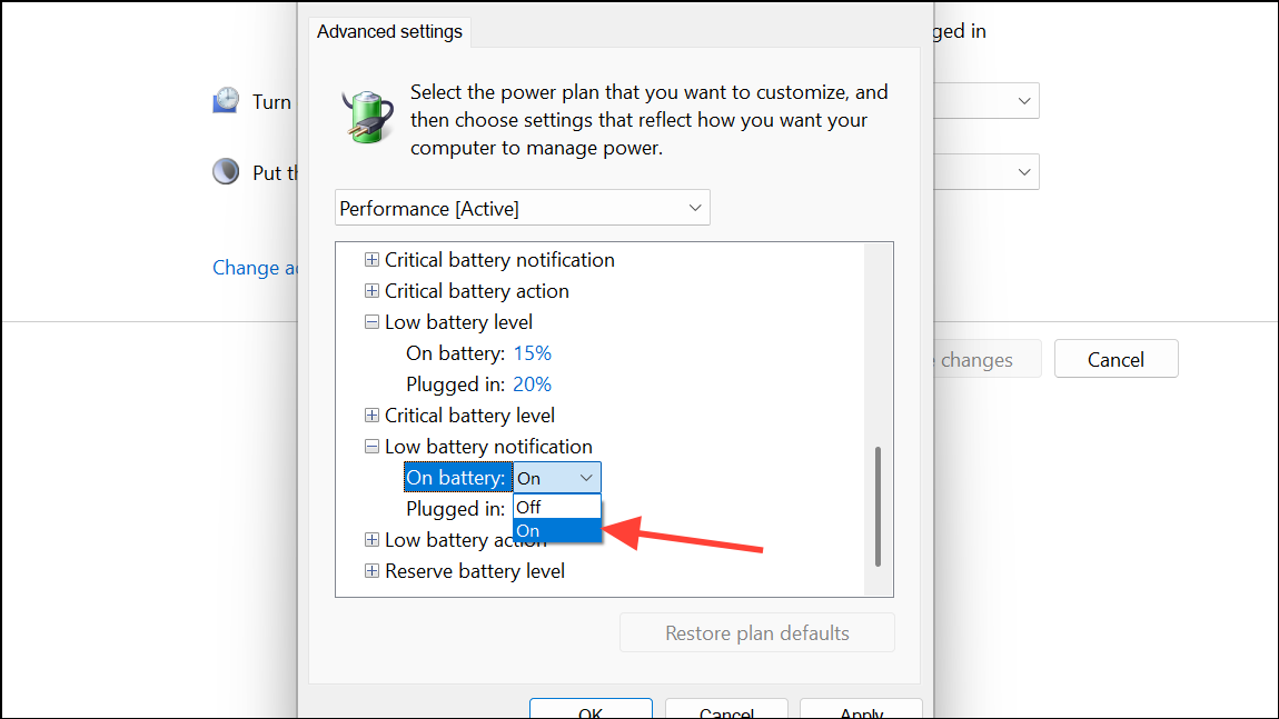 Step 3: In the Advanced settings window, scroll to the bottom and expand the Battery section. Expand Low battery level and set your preferred percentage (for example, 15% or 20%) for both On battery and Plugged in. This determines when the warning will trigger.