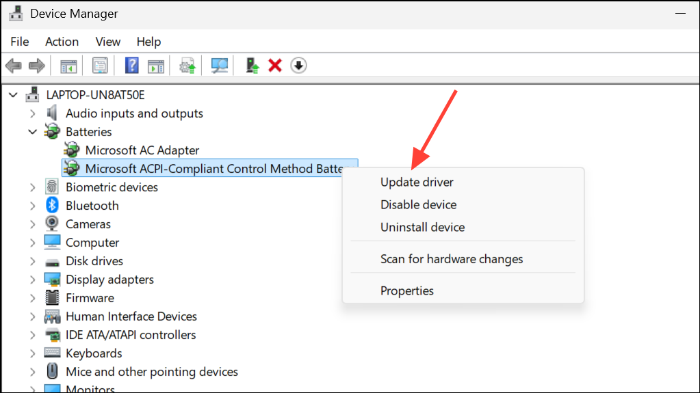 Step 2: Expand the Batteries section. Right-click on Microsoft ACPI-Compliant Control Method Battery and select Update driver.