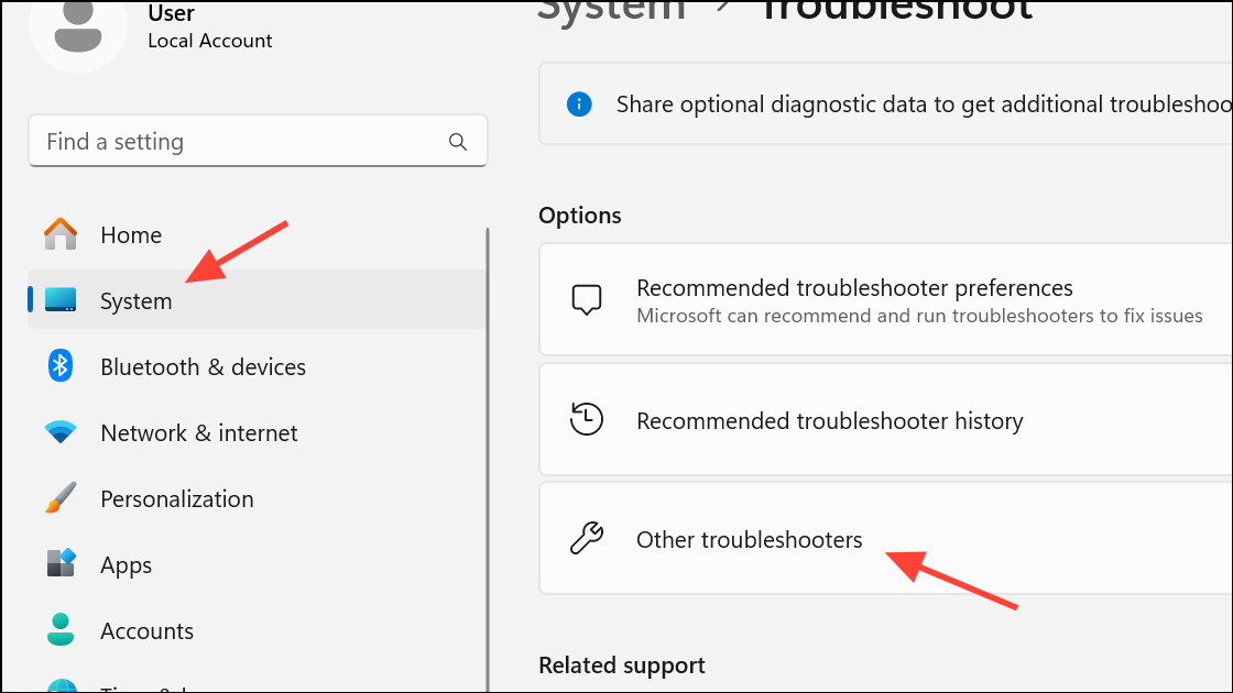 Step 3: To further diagnose issues, open Settings > System > Troubleshoot > Other troubleshooters.