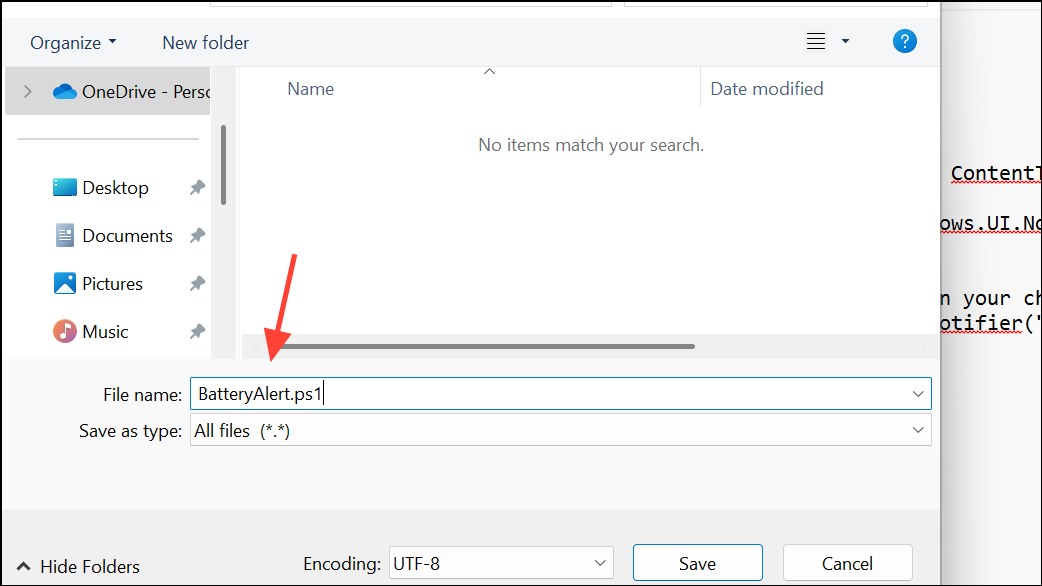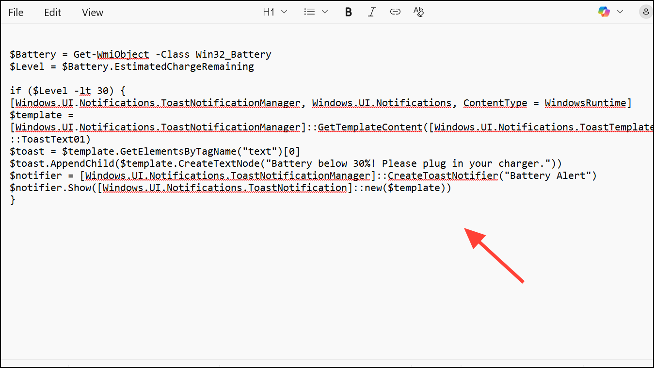Step 2: Save the file as BatteryAlert.ps1 and remember its location.