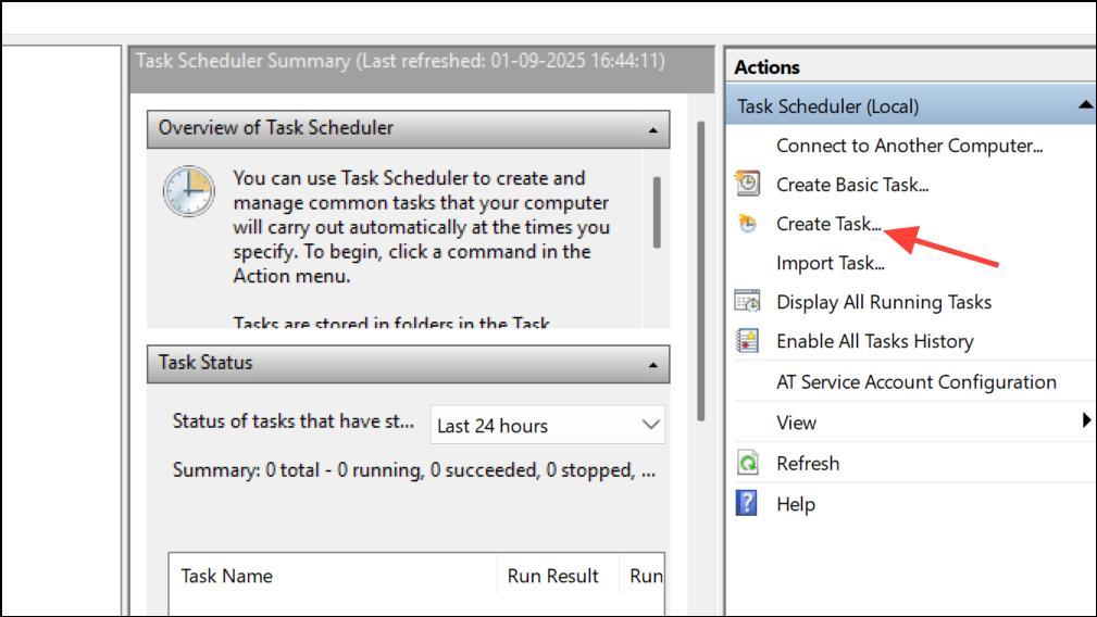 Step 3: Open Task Scheduler, select Create Task, and set the trigger to repeat every 5 minutes.