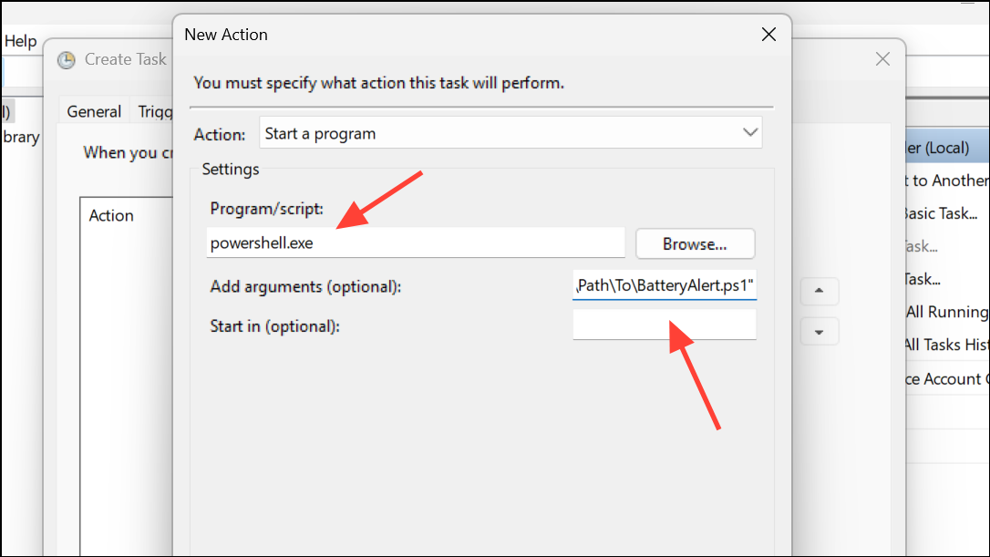 -ExecutionPolicy Bypass -File "C:\Path\To\BatteryAlert.ps1"Replace the path with your script’s location. This setup ensures you receive a pop-up notification when the battery drops below your chosen threshold.