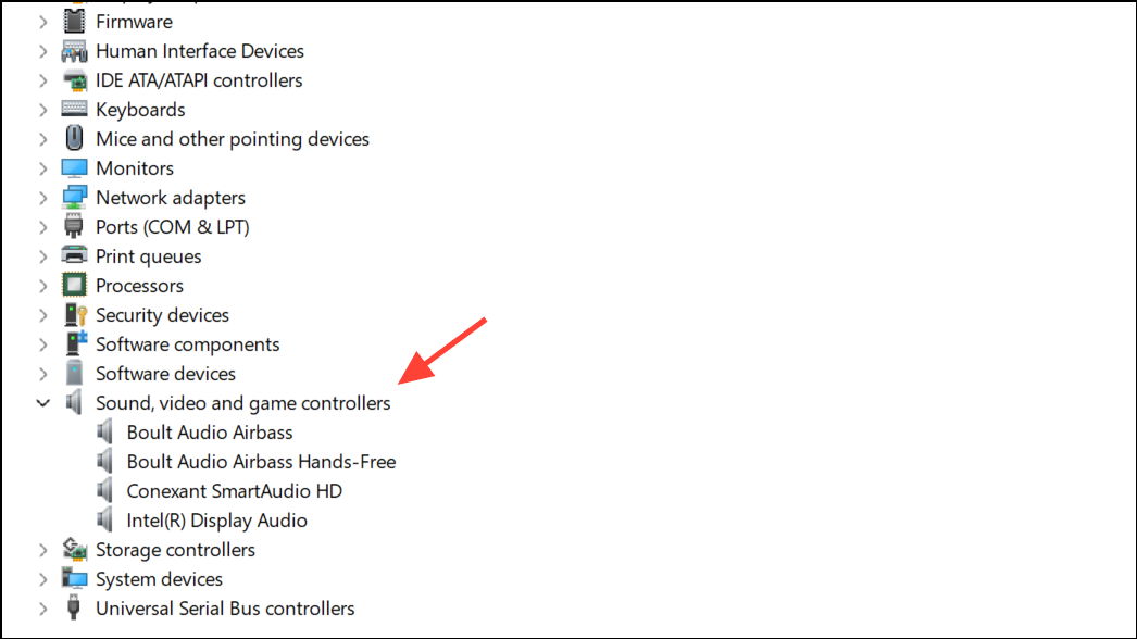 Step 2: Expand Sound, video and game controllers. If your audio device is missing, look for any unknown devices or items with a yellow exclamation mark.
