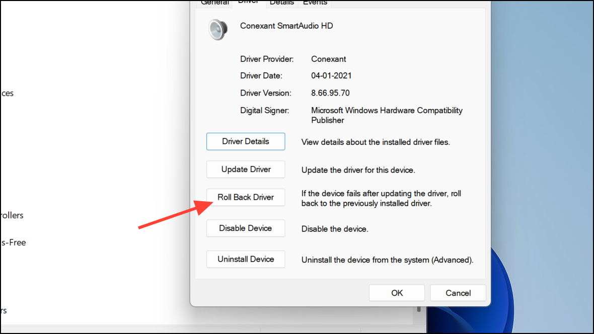 Step 2: Navigate to the Driver tab and select Roll Back Driver if the option is available. Follow the prompts and restart your computer.