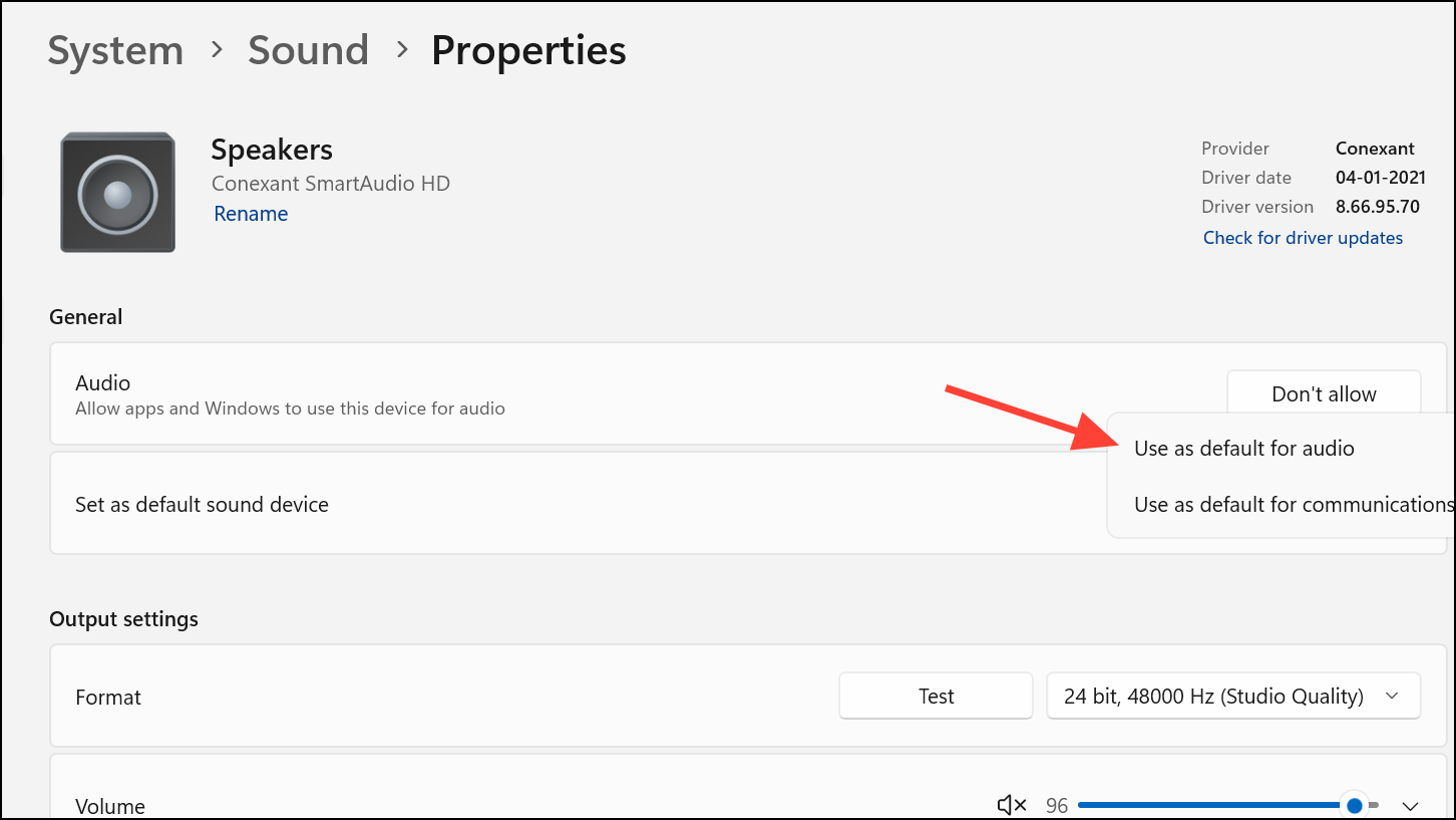 Step 3: To set a device as default, right-click the speaker icon and choose Sound settings. Under Output, select your main device and click Use as default for audio.