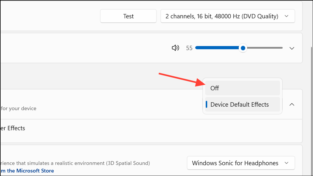 Step 2: Scroll to Advanced settings and set Audio enhancements to Off in the dropdown menu.
