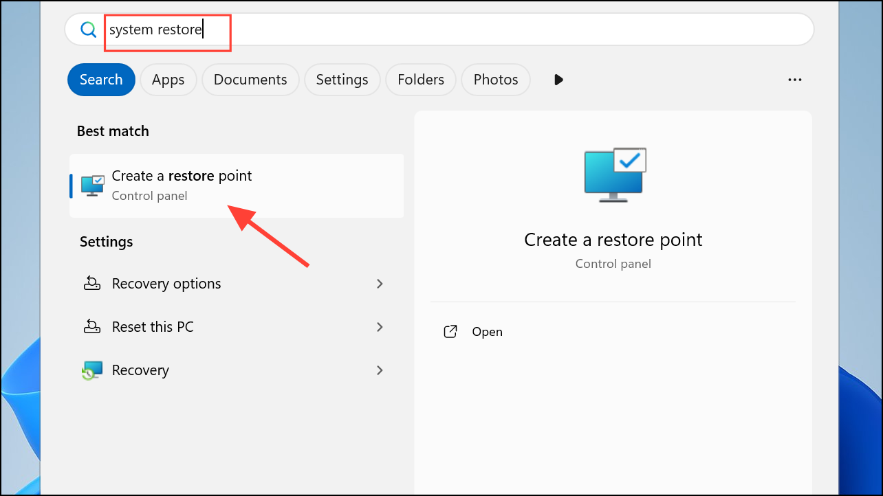 Step 1: Search for System Restore in the Start menu and follow the prompts to restore from a point before the update.