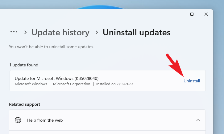 Step 3: Select the most recent update and click 'Uninstall'. Confirm the action when prompted.