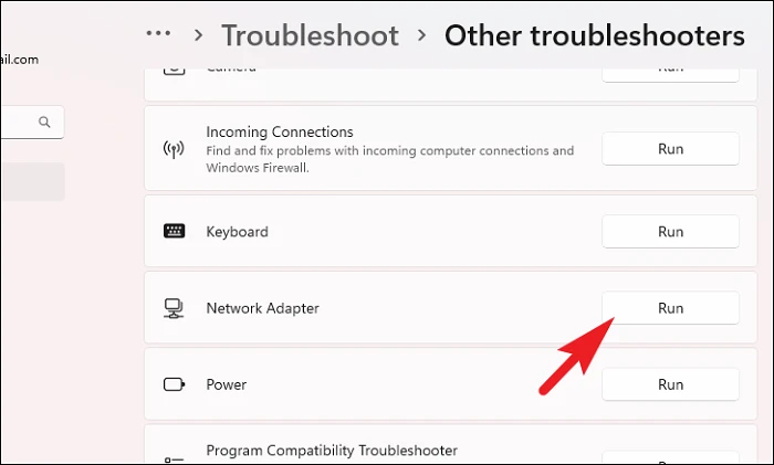 Step 5: If the issue persists, run the 'Network Adapter' troubleshooter by clicking 'Run' next to it.