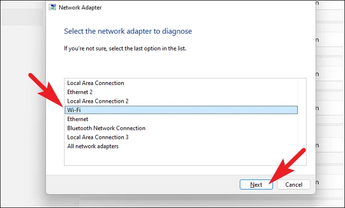 Step 6: Select 'Wi-Fi' and click 'Next' to allow the troubleshooter to detect and fix any problems with the Wi-Fi adapter.