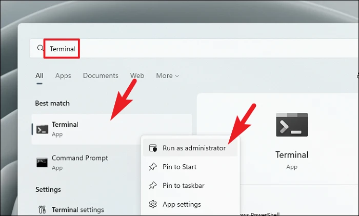 Step 1: Open the Start Menu and type Terminal. Right-click on 'Terminal' and choose 'Run as administrator'.