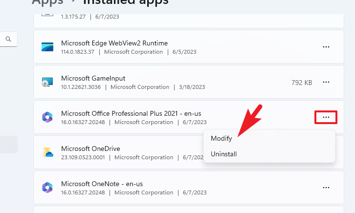 Step 4: Scroll through the list or use the search bar to find Microsoft Office. Once found, click on the ellipsis (three dots) next to it and choose Modify.