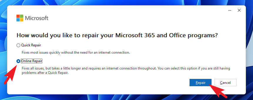 Step 6: In the Microsoft Office window that opens, select Online Repair and then click on Repair to initiate the process.