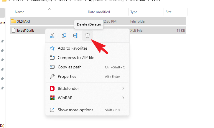 Step 3: Delete all the files in the Excel AppData folder by right-clicking and selecting Delete.