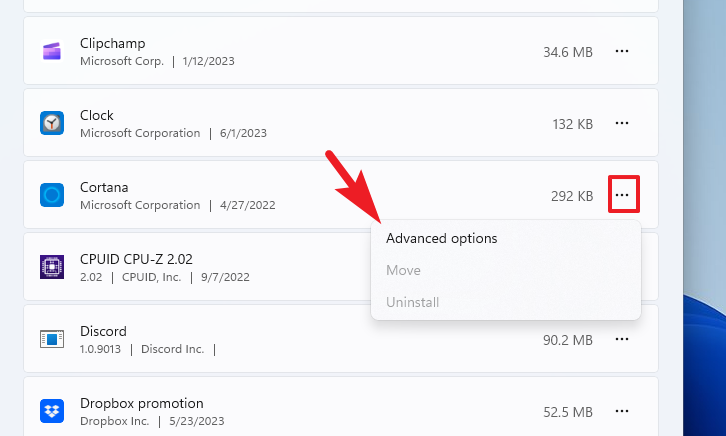 Step 4: Locate Cortana in the list. Click on the ellipsis next to it and select Advanced options.