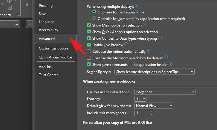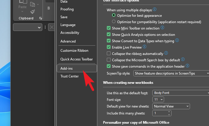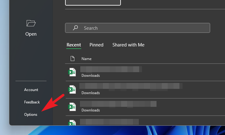 Step 4: In Excel, click on Options from the left sidebar to open Excel Options.