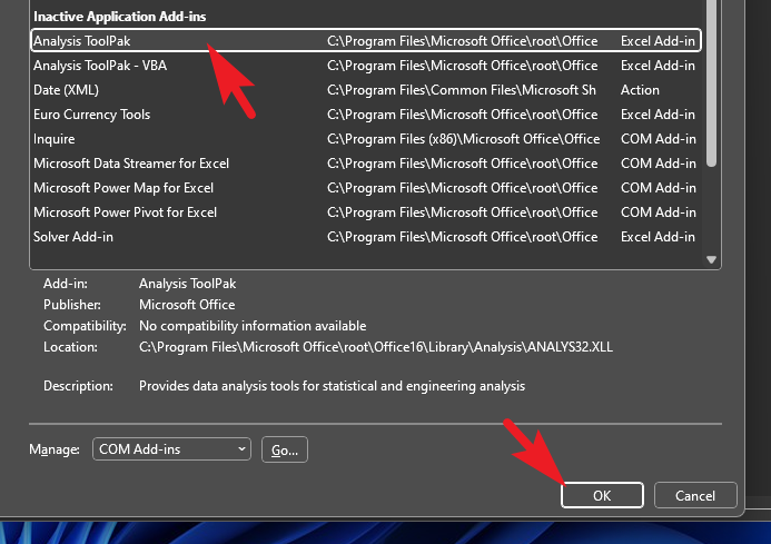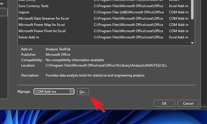 Step 6: At the bottom, select COM Add-ins from the Manage dropdown and click Go.