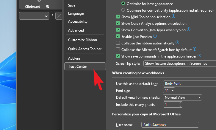 Step 2: In the Excel Options window, select Trust Center from the left panel.
