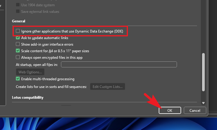 Step 3: Scroll down to the General section and uncheck the option Ignore other applications that use Dynamic Data Exchange (DDE). Click OK to save the changes.