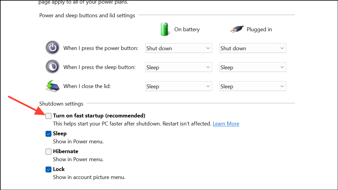 Step 4: Uncheck the option "Turn on fast startup (recommended)" and click "Save changes."