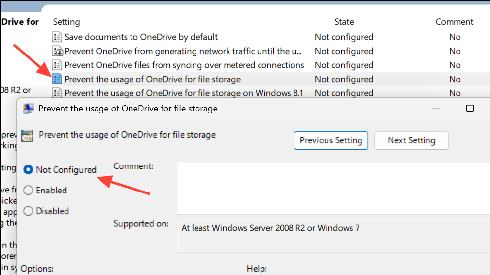 Step 3: Ensure Prevent the usage of OneDrive for file storage is set to Not Configured or Disabled. This setting should not block OneDrive functionality.