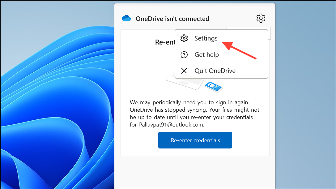 Step 1: Click the OneDrive cloud icon and select the gear icon to access Settings.