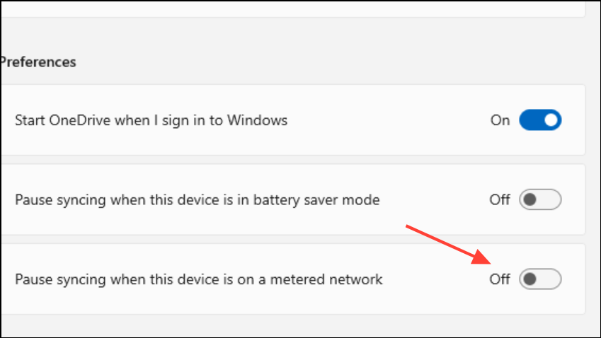 Step 2: In Windows 10, go to the Settings tab and uncheck Automatically pause sync when this device is on a metered network. On Windows 11, find these options under Sync and Backup. Disable Pause syncing when this device is on a metered network and Pause syncing when this device is in battery saver mode to prevent future interruptions.