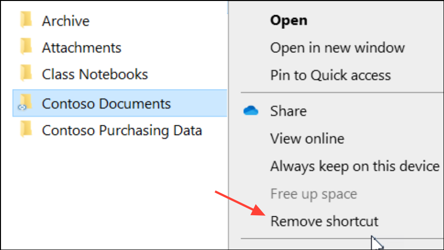 When a shortcut cannot be removed from File Explorer, stopping the sync for the affected folder and deleting it locally can help.