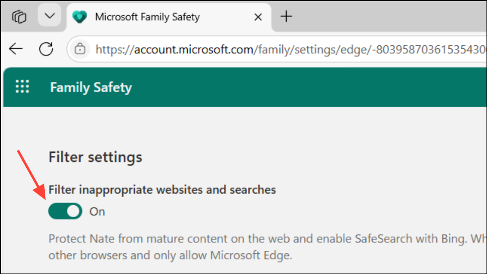 Step 2: Select the user profile experiencing issues. Navigate to the “Edge” tab, then look for the “Filter inappropriate websites” option. If enabled, this filter may block all browsers except Edge.