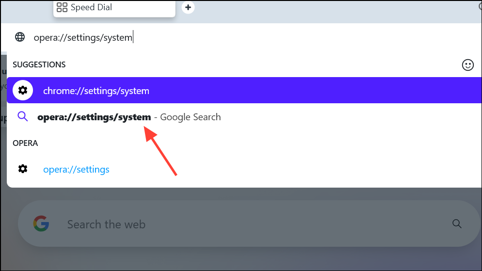 Step 2: Launch Opera (or Opera GX). In the address bar, enter opera://settings/system and press Enter.