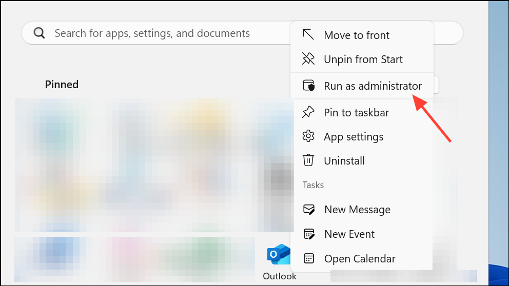 Step 2: Right-click the Outlook shortcut and select Run as administrator. This grants Outlook the necessary permissions to access the OST file.