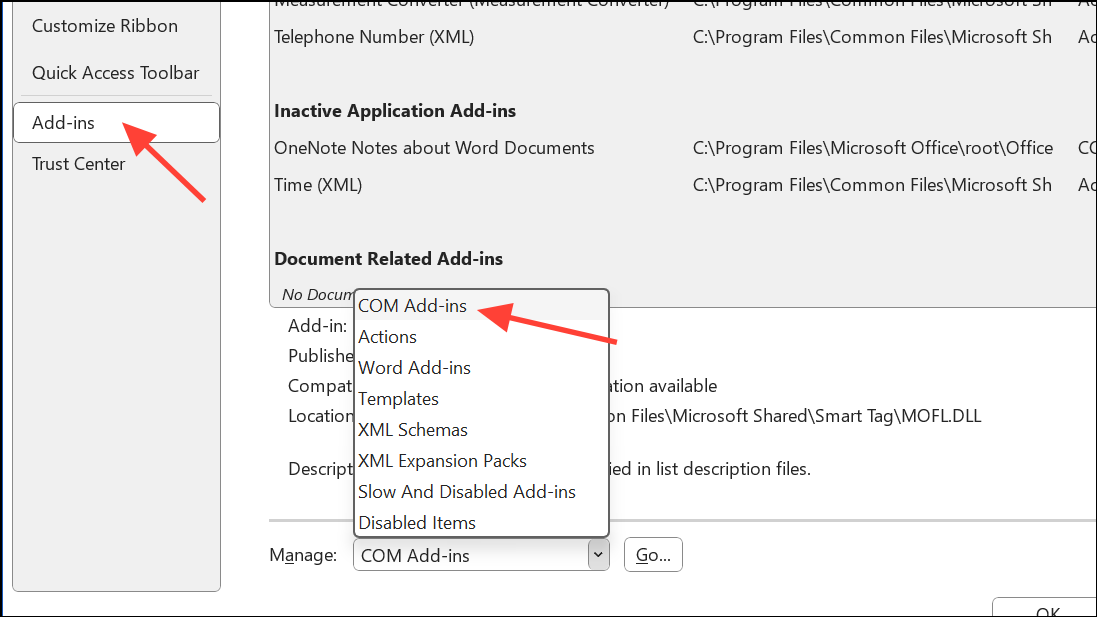 Step 2: In Outlook, go to File > Options > Add-ins. At the bottom, select COM Add-ins and click Go. Uncheck all add-ins, click OK, and restart Outlook normally. Re-enable add-ins one at a time to identify the problematic one.