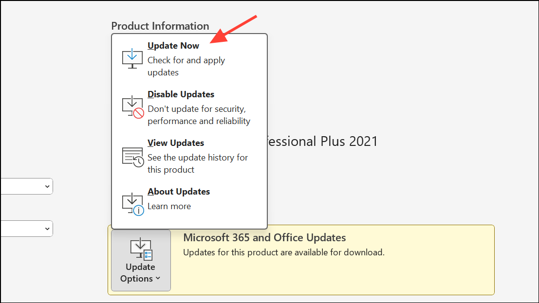 Step 2: After the repair, check for updates by going to File > Office Account > Update Options > Update Now in Outlook.