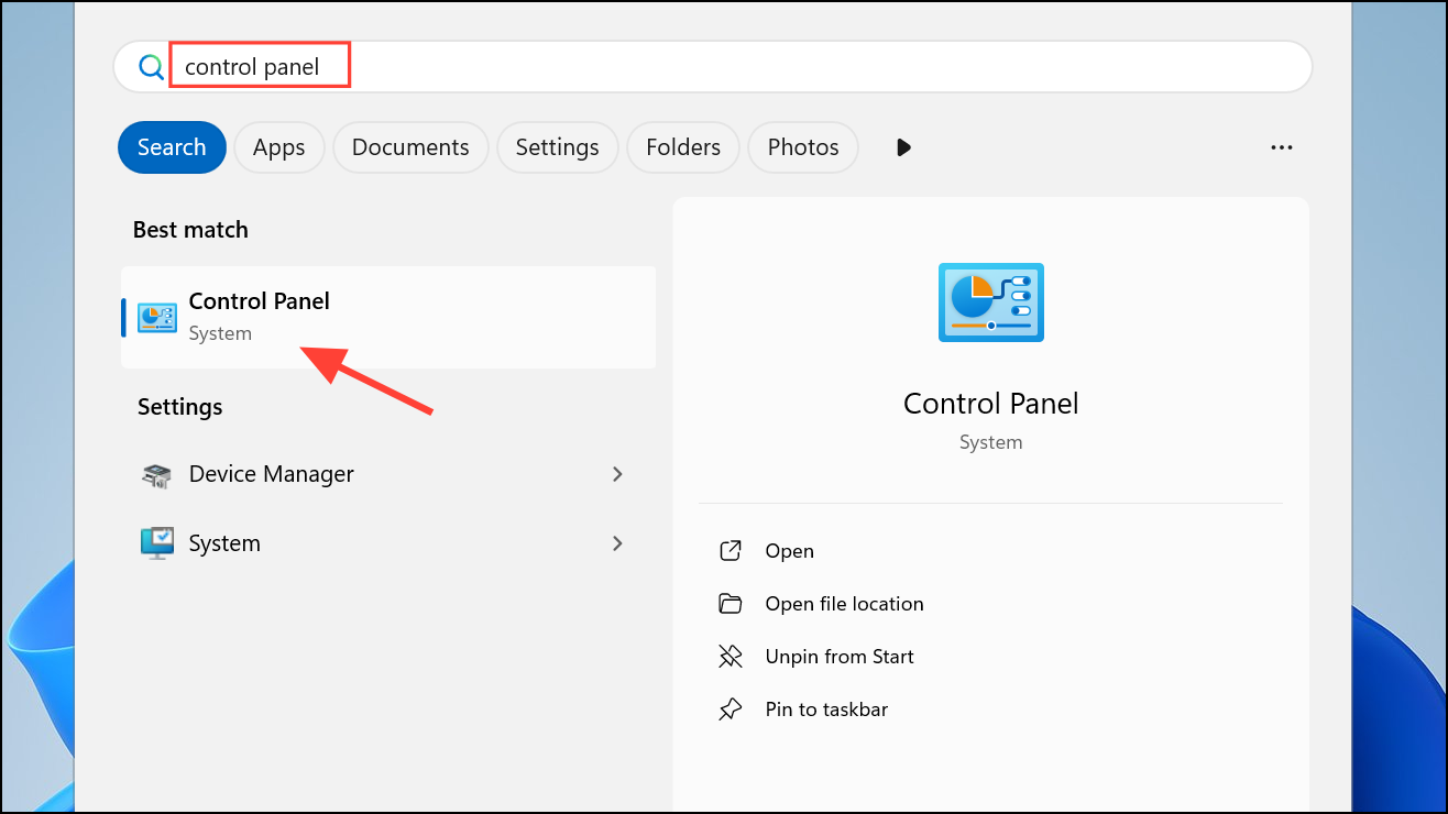Step 2: Open the Windows Control Panel by pressing Windows Key + S and typing Control Panel, then pressing Enter.