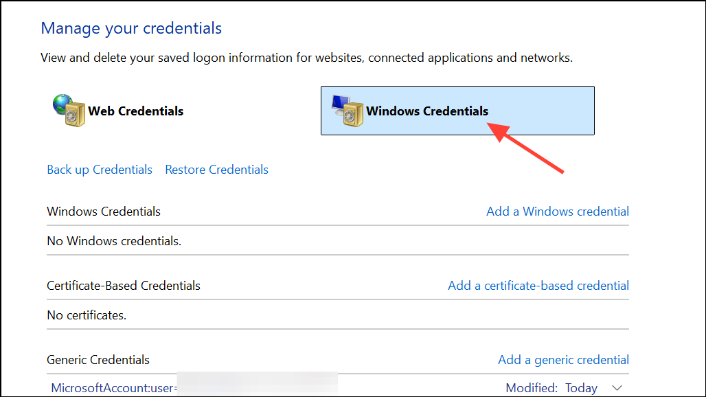 Step 3: Select User Accounts, then click Credential Manager in the left column. Choose Windows Credentials to view all stored credentials.