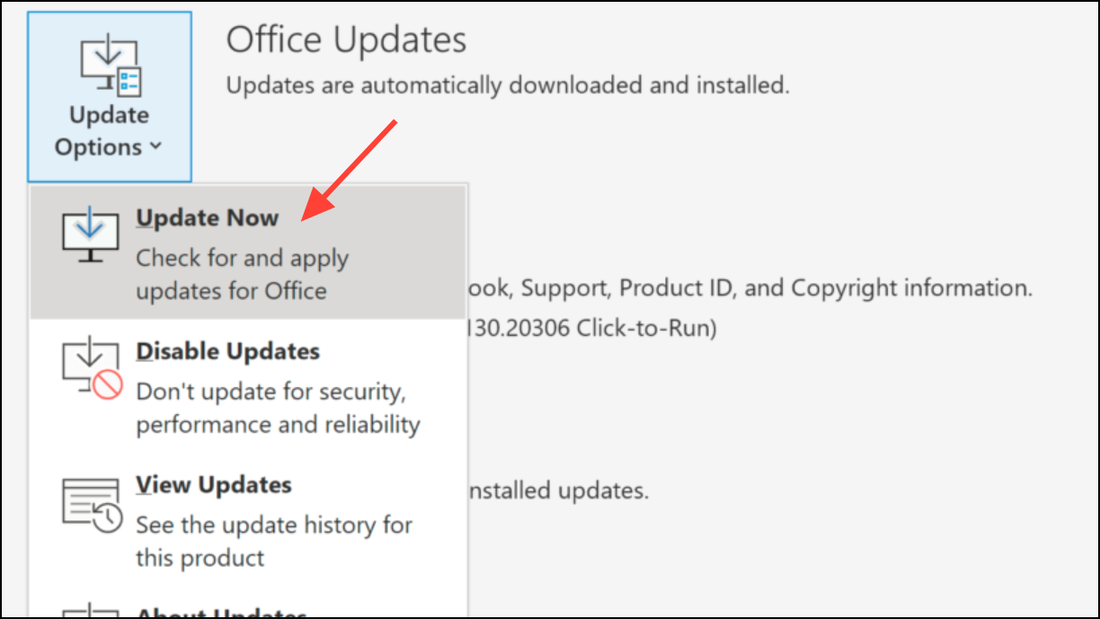 Step 1: Go to File > Office Account in Outlook and click Update Options > Update Now. This checks for and installs any available Outlook updates, which may resolve bugs causing repeated password prompts.
