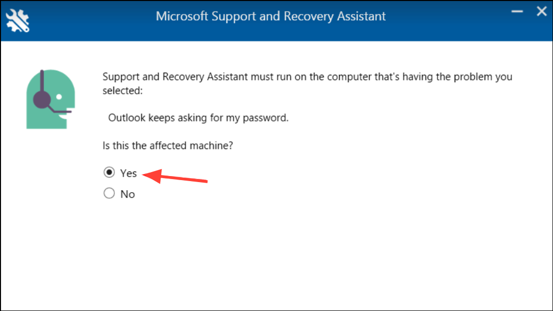 Step 3: Launch SaRA, select Outlook, then choose Outlook keeps asking for my password. Follow the on-screen instructions to let the tool analyze your Outlook configuration and apply recommended fixes.