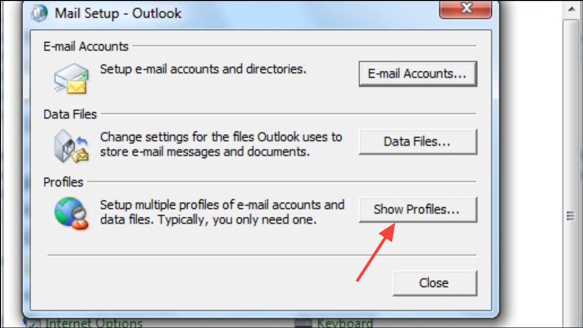 Step 1: Exit Outlook and open the Control Panel. Select Mail (or Mail (Microsoft Outlook)) and click Show Profiles.